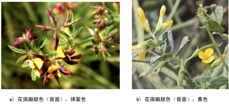 - 性状17 旗瓣颜色:绛紫色或黄色