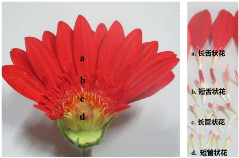 单瓣品种:长舌状花、长管状花和短管状花组成