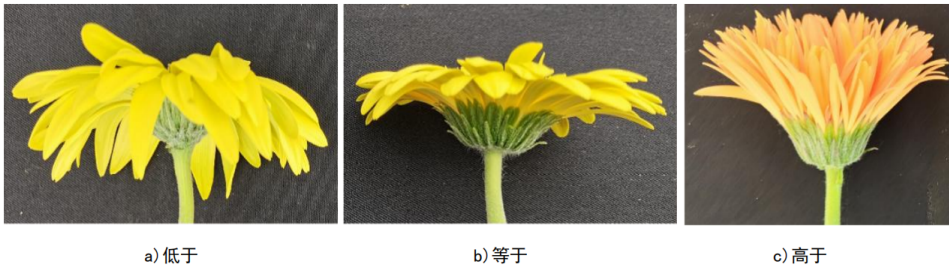 - 舌状花先端与总苞顶端相对位置:低于、等于或高于