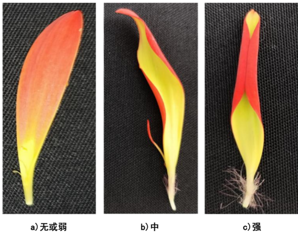 - 长舌状花花瓣卷曲程度:无/弱、中或强
