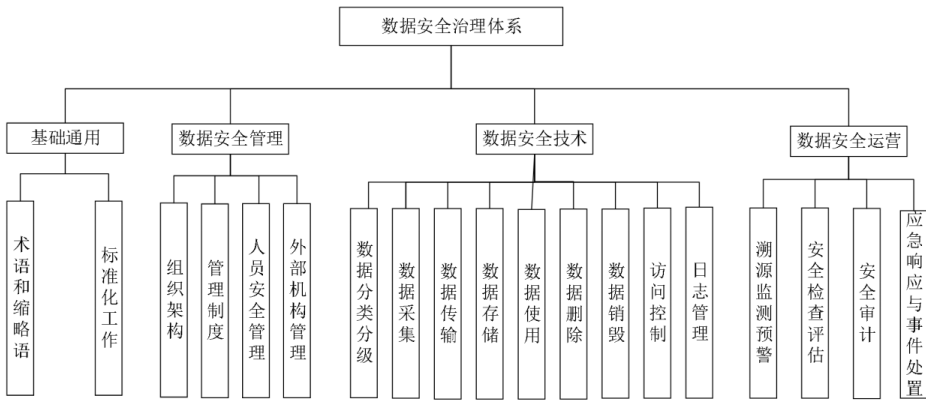 标准提出了完整的数据安全治理体系框架,包括基础通用、数据安全管理、数据安全技术和数据安全运营四个主要组成部分。