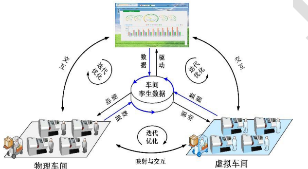 以纺织车间为例,展示了数字孪生车间体系架构、模型构建流程和数模联动机制,包括: