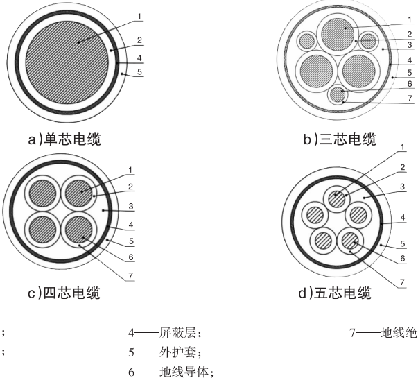 电缆芯数分为单芯、三芯、四芯和五芯,结构示意图如下: