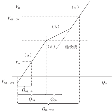 Q_{/text{GS,th(ON)}}:从V_{/text{OFF}}到V_{/text{th}}的电荷量(曲线初始段)。Q_{/text{GS(ON)}}:从V_{/text{OFF}}到米勒斜坡开始处的电荷量。Q_{/text{GD(ON)}}:处理米勒斜坡(DIBL效应导致倾斜)—将曲线反向延伸(图9段c),连接辅助线(段d),映射电荷区间。Q_{/text{G,TOT(ON)}}:从V_{/text{OFF}}到V_{/text{ON}}的总电荷量。